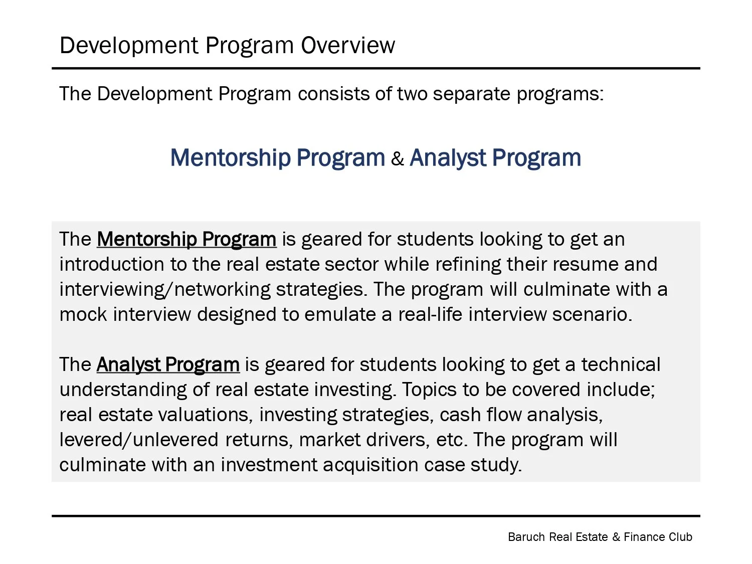 The Development Program consists of two separate programs: The Mentorship Program and The Analyst Program. Each program is exclusive; top-tier applicants are interviewed and then admitted on a merit basis. Both programs are taught through a combination of a lecture-style and interactive lessons. A final case study that summarizes all of the skills learned will be held toward the end of the program.